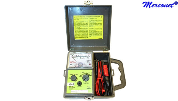 De IM40 is een analoge isolatie tester met een bereik tot 50 MOhm. De IM40 heeft een nulstellingsknop voor de weerstand. De IM40 heeft drie isolatie testspanningen en twee continuïteitsbereiken. De IM40 heeft een duidelijk afleesbaar display. Er is een visuele indicatie voor actieve aansluitingen. De IM40 MegOhmr isolatiemeter is beschermd tegen een overspanning van CAT III 600 Volt. De IM40 heeft een stevige kunststof behuizing.