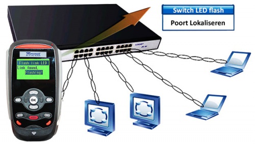 Dataherkenner: Bij aansluitingen waarvan niet bekend is welk protocol actief is, geeft de dataherkenner functie op het display weer of POTS, Ethernet, ISDN/PoE of geen protocol actief is. Aderzoeker: Indien in het gebouw onafgewerkte bekabeling met of zonder patchpanelen en aansluitdozen aanwezig is, beschikt de LS19 over een generator die verschillende tonen naar keuze kan genereren op één ader, een aderpaar of alle aders te gelijk. Hiermee kunnen kabels en aansluitingen worden gevonden zonder te strippen, aan te sluiten en of contact te maken. Dit signaal kan ontvangen worden met de ontvanger. Lengtemeter: Hiermee wordt de lengte tot een open einde bepaald. De lengte wordt gemeten door middel van het capaciteit principe met een bereik van 457 meter. Hierbij wordt een waarde ingesteld, waardoor de kabellengte nauwkeurig wordt gemeten. Deze waarde kan uit een tabel worden gehaald, maar kan ook zelf worden bepaald met een bekende kabellengte. Tevens worden de afzonderlijke aderparen gemeten. Zowel channel als permanent link metingen zijn mogelijk. De maximale channel link voor Cat. 6 is 90 meter. Werkpleknummering (Met loopback & werkplekadapter): Voor netwerken die volledig gemonteerd en of aangesloten zijn, maar waar de werkpleknummering incorrect is of ontbreekt, kan de LS19 8 aansluitingen tegelijkertijd herkennen. 1-8 en afscherming tester: Hierdoor wordt gecontroleerd of de acht aders en of de afscherming die zich in een kabel of shielded kabel bevinden goed zijn aangesloten. Meerdere verwisselingen worden gelijktijdig gemeten en worden overzichtelijk op het display getoond. Ook wordt er getoond of de afscherming correct is aangesloten. Split pair test: Controleert of de vier paren die in een kabel aanwezig zijn, goed op elkaar zijn aangesloten. Het voorkomt split pair fouten die data timing errors maken op het netwerk. Patchkabels: Een veel voorkomende fout is het niet controleren van patchkabels die nieuw uit de doos komen bij geleverde apparatuur. De LS19 maakt deze controle mogelijk. Een tweede fout op patchkabels ontstaat doordat de totale lengte (Channel Link) het maximum overschrijdt wat zorgt voor timing errors en CRC fouten. Aansluitingzoeker: Op een netwerk waar Ethernet al actief is, kan de LS19 de LED’s van een hub of switch laten knipperen met een herkenbaar patroon. PoE: Dit instrument detecteert PoE. Voor VoIP apparatuur is er een voedingspanning nodig op de Ethernet bekabeling. IP Ping: Door de ping en responstijden wordt er getest of een verbinding met apparaten en of het internet mogelijk is. Er kan gecontroleerd worden of er verbindingen gemaakt kunnen worden naar hub's, werkstations, modems, servers, routers, DNS en switches. De LS19 toont DHCP informatie en meet ook de snelheid (Rx & Tx). Netwerkscanner: Met de netwerkscanner wordt het IP en MAC adres van alle actieve apparaten op het netwerk weergegeven. Hierdoor is direct te zien hoeveel actieve apparaten op het netwerk aanwezig zijn.