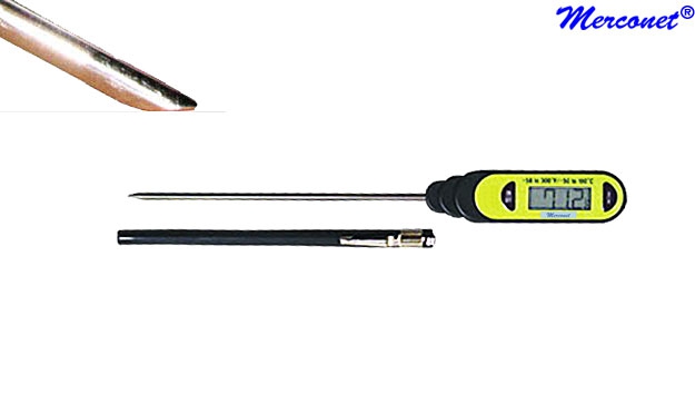 The sensor is in the tip of the probe and needs to be 1. 27 cm (1/2 inch) into whatever you are measuring. 3. What battery does my pocket thermometer use?